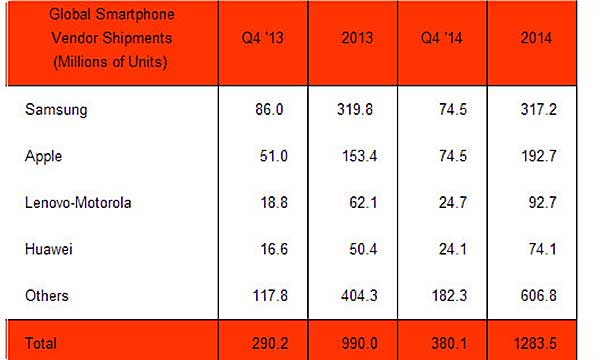 Strategy Analytics是全球著名的信息技术,通信行业和消费科技市场研究及咨询机构。SA总部设立于美国波士顿。据Strategy Analytics的最新统计报告显示,2014年第四季度,全球智能手机出货量3.80亿部,相比2013年同期的2.90亿部大幅增长31%。全年累计出货量12.83亿部,同比增长29.60%,2013年全年智能手机出货量为9.90亿部。