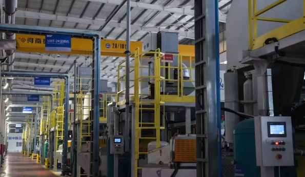 在万里扬新材料的压铸车间,27台压铸机整齐排列,6米多高的设备持续将液态合金原料精准转化为铝合金零部件。